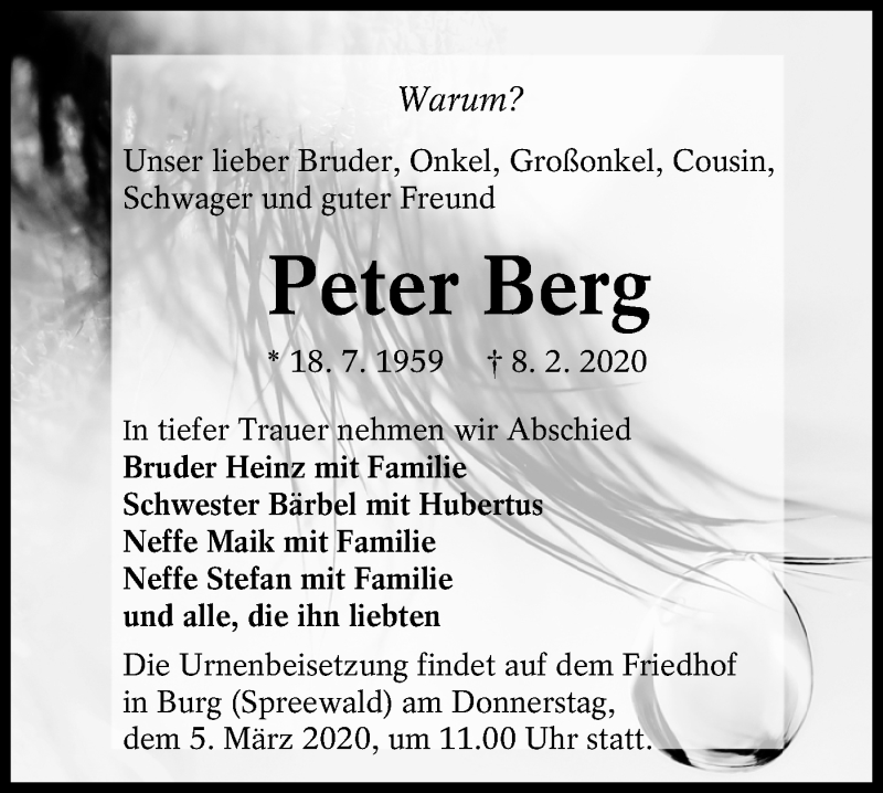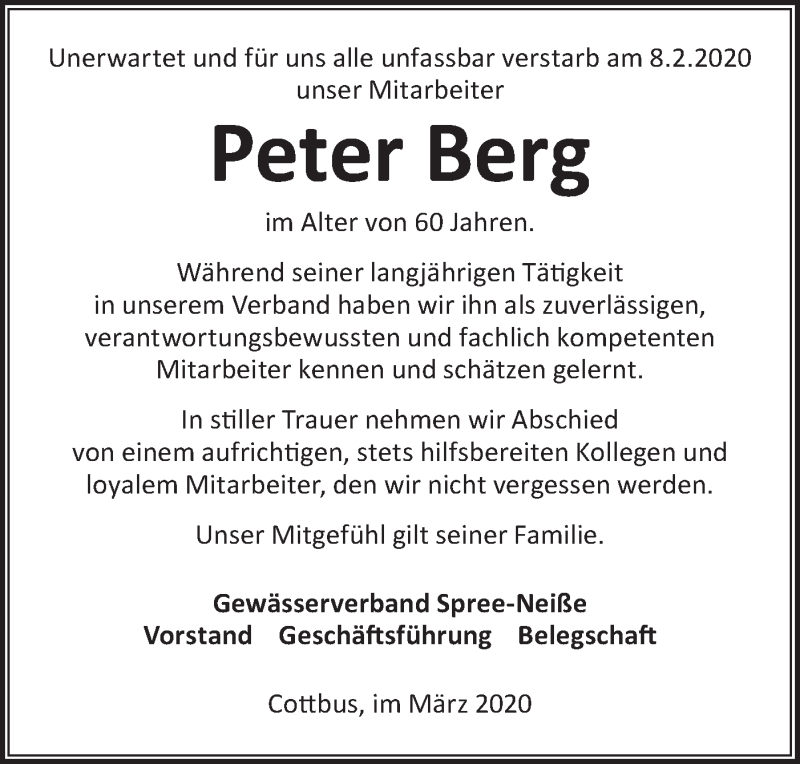 Hier finden Sie alle Traueranzeigen aus der Zeitung, die bisher für Peter Berg erschienen sind. Weitere Traueranzeigen, die in der Zeitung erscheinen, werden hier ebenfalls aufgelistet