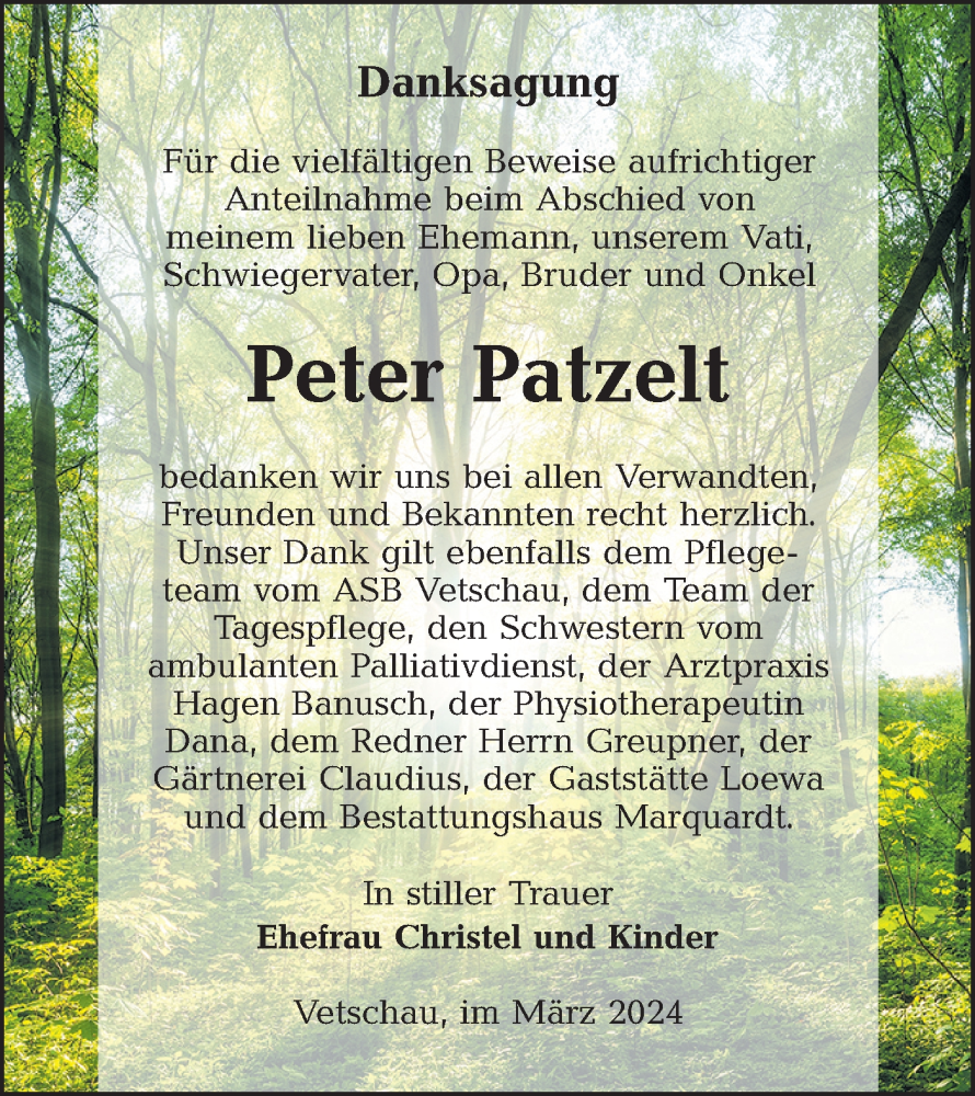 Hier finden Sie alle Traueranzeigen aus der Zeitung, die bisher für Peter Patzelt erschienen sind. Weitere Traueranzeigen, die in der Zeitung erscheinen, werden hier ebenfalls aufgelistet