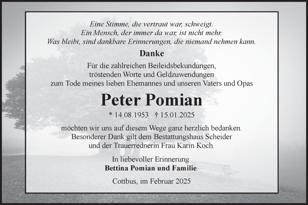 Hier finden Sie alle Traueranzeigen aus der Zeitung, die bisher für Peter Pomian erschienen sind. Weitere Traueranzeigen, die in der Zeitung erscheinen, werden hier ebenfalls aufgelistet