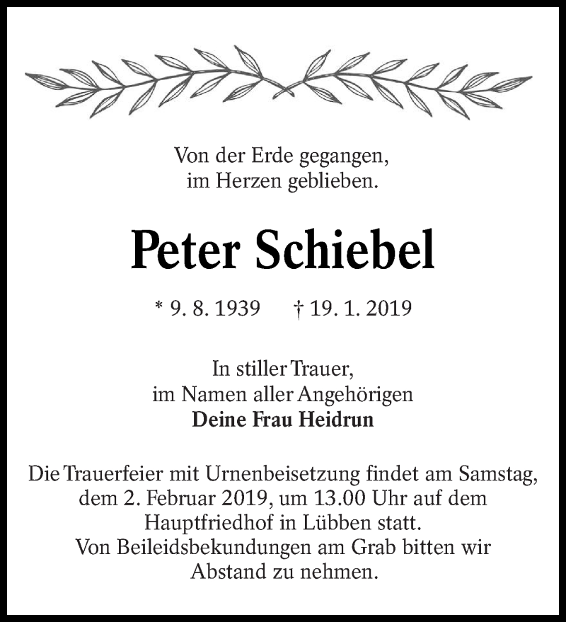 Hier finden Sie alle Traueranzeigen aus der Zeitung, die bisher für Peter Schiebel erschienen sind. Weitere Traueranzeigen, die in der Zeitung erscheinen, werden hier ebenfalls aufgelistet