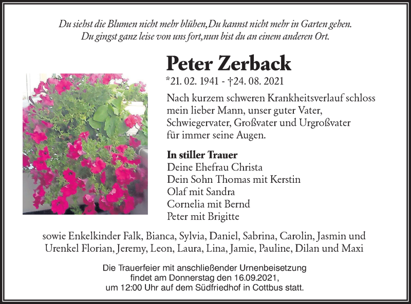 Hier finden Sie alle Traueranzeigen aus der Zeitung, die bisher für Peter Zerback erschienen sind. Weitere Traueranzeigen, die in der Zeitung erscheinen, werden hier ebenfalls aufgelistet