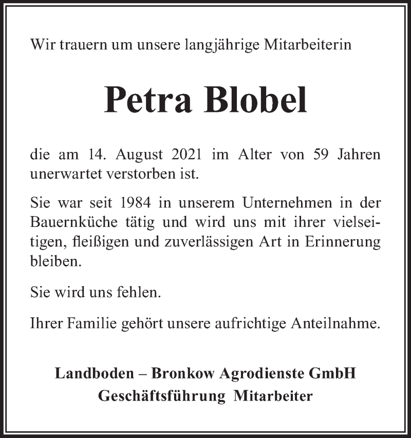 Hier finden Sie alle Traueranzeigen aus der Zeitung, die bisher für Petra Blobel erschienen sind. Weitere Traueranzeigen, die in der Zeitung erscheinen, werden hier ebenfalls aufgelistet