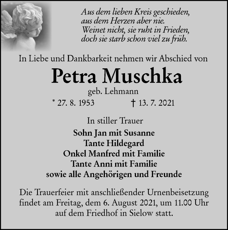 Hier finden Sie alle Traueranzeigen aus der Zeitung, die bisher für Petra Muschka erschienen sind. Weitere Traueranzeigen, die in der Zeitung erscheinen, werden hier ebenfalls aufgelistet