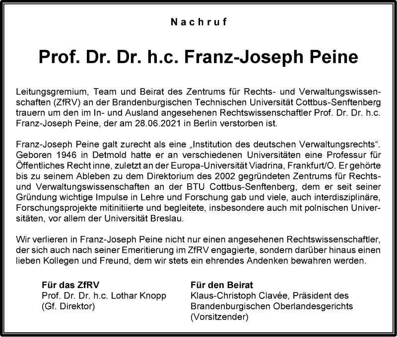 Hier finden Sie alle Traueranzeigen aus der Zeitung, die bisher für Prof. Dr. Dr. h.c. Franz-Joseph Peine erschienen sind. Weitere Traueranzeigen, die in der Zeitung erscheinen, werden hier ebenfalls aufgelistet