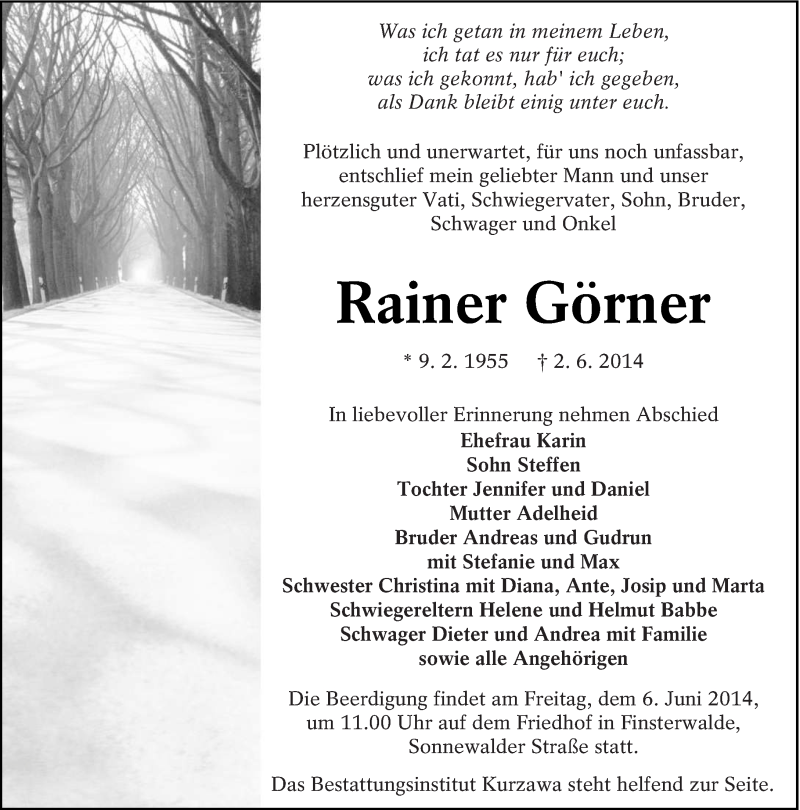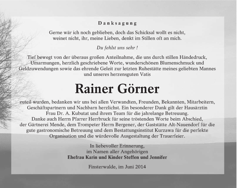 Hier finden Sie alle Traueranzeigen aus der Zeitung, die bisher für Rainer Görner erschienen sind. Weitere Traueranzeigen, die in der Zeitung erscheinen, werden hier ebenfalls aufgelistet