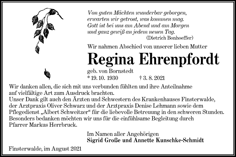 Hier finden Sie alle Traueranzeigen aus der Zeitung, die bisher für Regina Ehrenpfordt erschienen sind. Weitere Traueranzeigen, die in der Zeitung erscheinen, werden hier ebenfalls aufgelistet