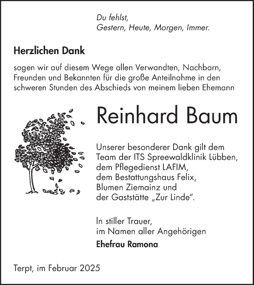 Hier finden Sie alle Traueranzeigen aus der Zeitung, die bisher für Reinhard Baum erschienen sind. Weitere Traueranzeigen, die in der Zeitung erscheinen, werden hier ebenfalls aufgelistet