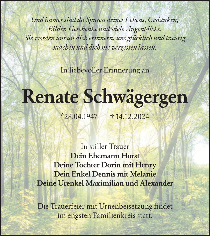 Hier finden Sie alle Traueranzeigen aus der Zeitung, die bisher für Renate Schwägergen erschienen sind. Weitere Traueranzeigen, die in der Zeitung erscheinen, werden hier ebenfalls aufgelistet