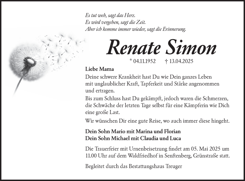 Hier finden Sie alle Traueranzeigen aus der Zeitung, die bisher für Renate Simon erschienen sind. Weitere Traueranzeigen, die in der Zeitung erscheinen, werden hier ebenfalls aufgelistet