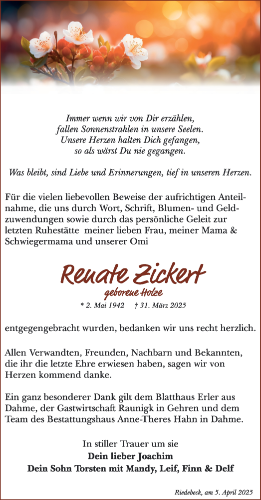 Hier finden Sie alle Traueranzeigen aus der Zeitung, die bisher für Renate Zickert erschienen sind. Weitere Traueranzeigen, die in der Zeitung erscheinen, werden hier ebenfalls aufgelistet