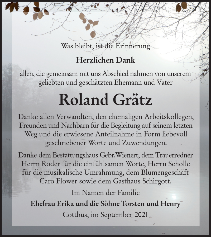 Hier finden Sie alle Traueranzeigen aus der Zeitung, die bisher für Roland Grätz erschienen sind. Weitere Traueranzeigen, die in der Zeitung erscheinen, werden hier ebenfalls aufgelistet