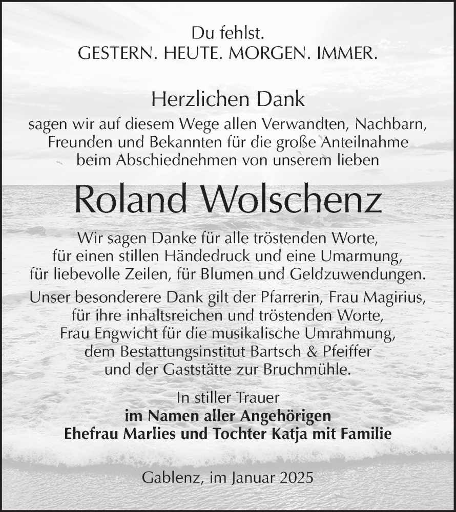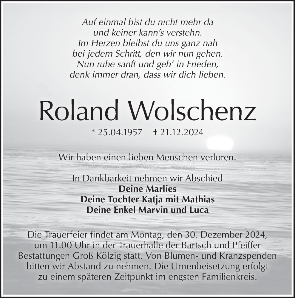 Hier finden Sie alle Traueranzeigen aus der Zeitung, die bisher für Roland Wolschenz erschienen sind. Weitere Traueranzeigen, die in der Zeitung erscheinen, werden hier ebenfalls aufgelistet