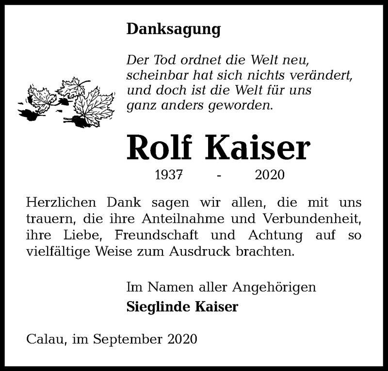 Hier finden Sie alle Traueranzeigen aus der Zeitung, die bisher für Rolf Kaiser erschienen sind. Weitere Traueranzeigen, die in der Zeitung erscheinen, werden hier ebenfalls aufgelistet