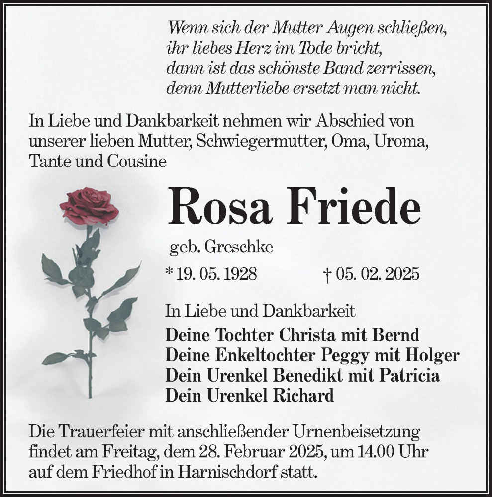 Hier finden Sie alle Traueranzeigen aus der Zeitung, die bisher für Rosa Friede erschienen sind. Weitere Traueranzeigen, die in der Zeitung erscheinen, werden hier ebenfalls aufgelistet