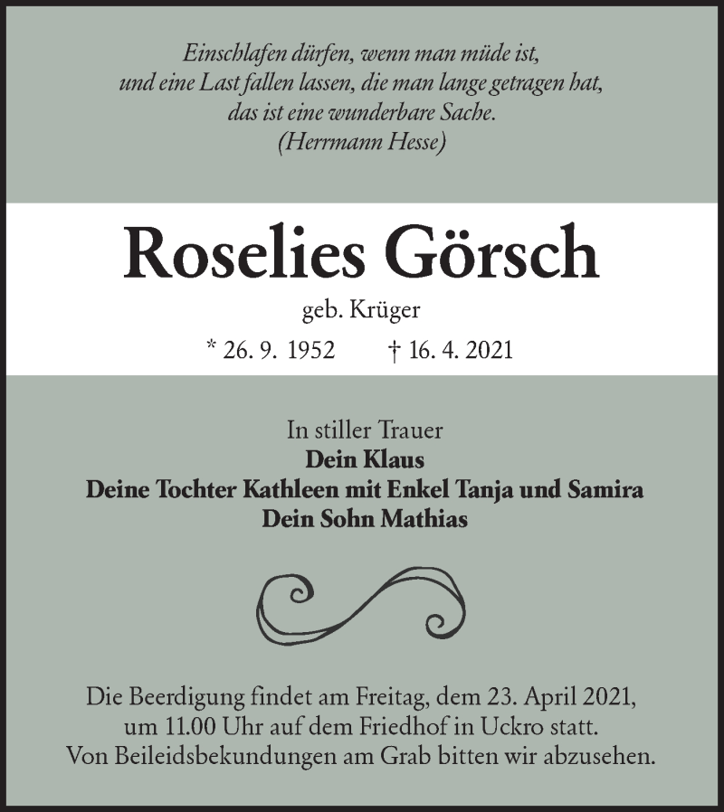 Hier finden Sie alle Traueranzeigen aus der Zeitung, die bisher für Roselies Görsch erschienen sind. Weitere Traueranzeigen, die in der Zeitung erscheinen, werden hier ebenfalls aufgelistet