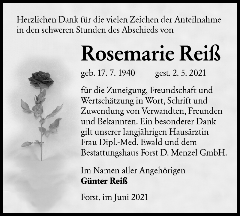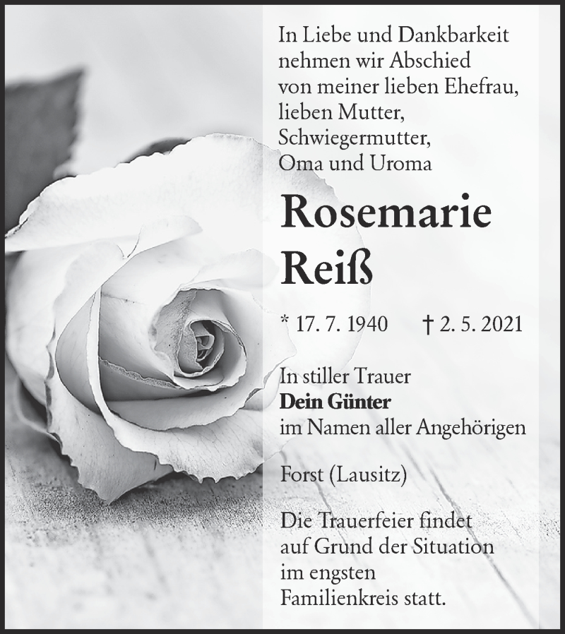 Hier finden Sie alle Traueranzeigen aus der Zeitung, die bisher für Rosemarie Reiß erschienen sind. Weitere Traueranzeigen, die in der Zeitung erscheinen, werden hier ebenfalls aufgelistet