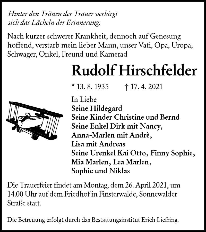 Hier finden Sie alle Traueranzeigen aus der Zeitung, die bisher für Rudolf Hirschfelder erschienen sind. Weitere Traueranzeigen, die in der Zeitung erscheinen, werden hier ebenfalls aufgelistet