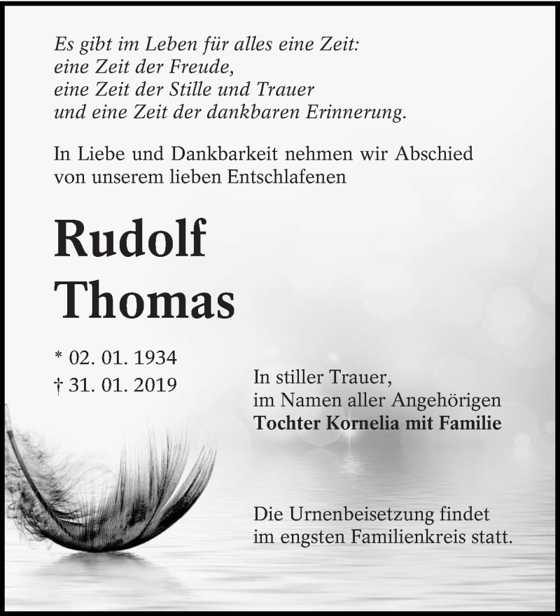 Hier finden Sie alle Traueranzeigen aus der Zeitung, die bisher für Rudolf Thomas erschienen sind. Weitere Traueranzeigen, die in der Zeitung erscheinen, werden hier ebenfalls aufgelistet