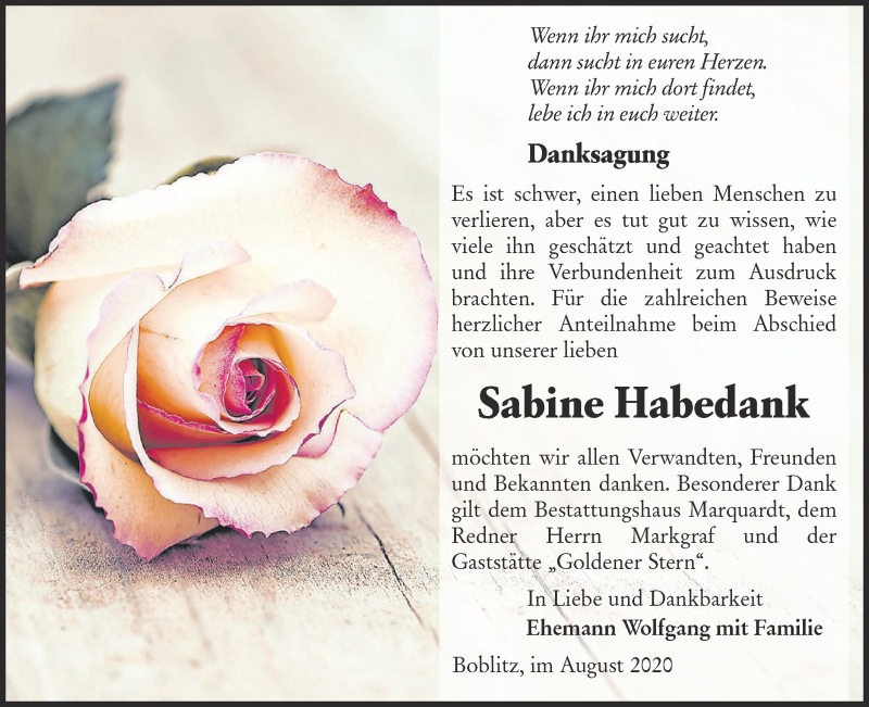 Hier finden Sie alle Traueranzeigen aus der Zeitung, die bisher für Sabine Habedank erschienen sind. Weitere Traueranzeigen, die in der Zeitung erscheinen, werden hier ebenfalls aufgelistet