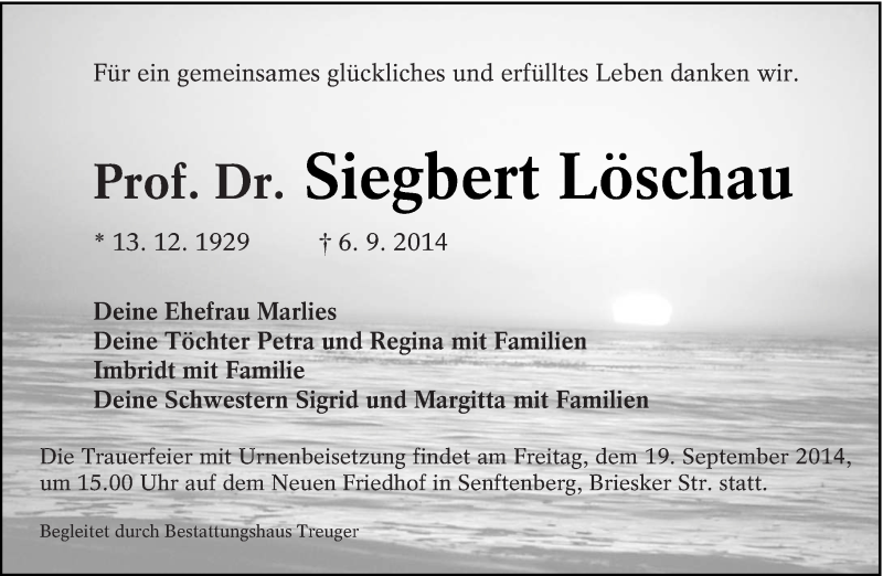 Hier finden Sie alle Traueranzeigen aus der Zeitung, die bisher für Siegbert Löschau erschienen sind. Weitere Traueranzeigen, die in der Zeitung erscheinen, werden hier ebenfalls aufgelistet