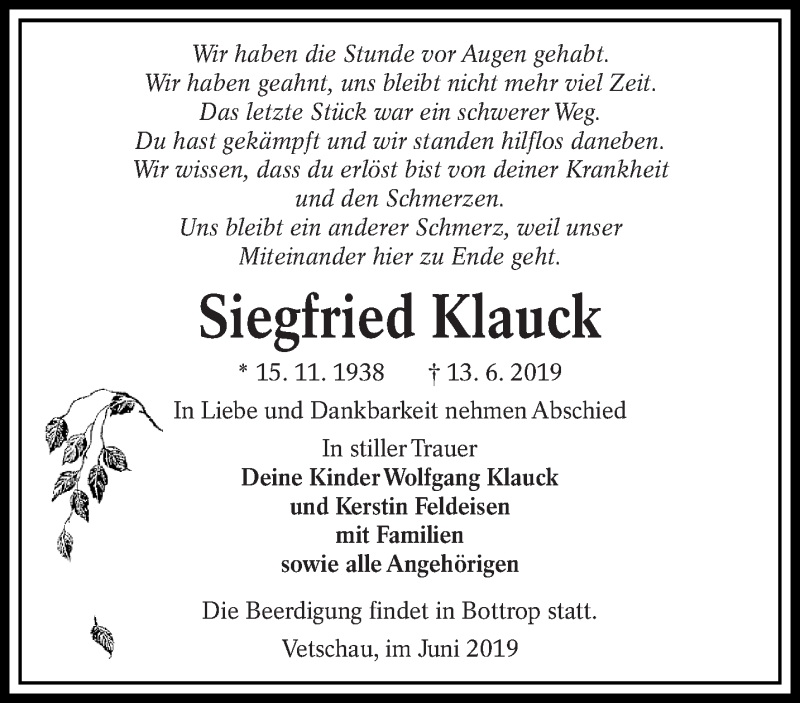 Hier finden Sie alle Traueranzeigen aus der Zeitung, die bisher für Siegfried Klauck erschienen sind. Weitere Traueranzeigen, die in der Zeitung erscheinen, werden hier ebenfalls aufgelistet