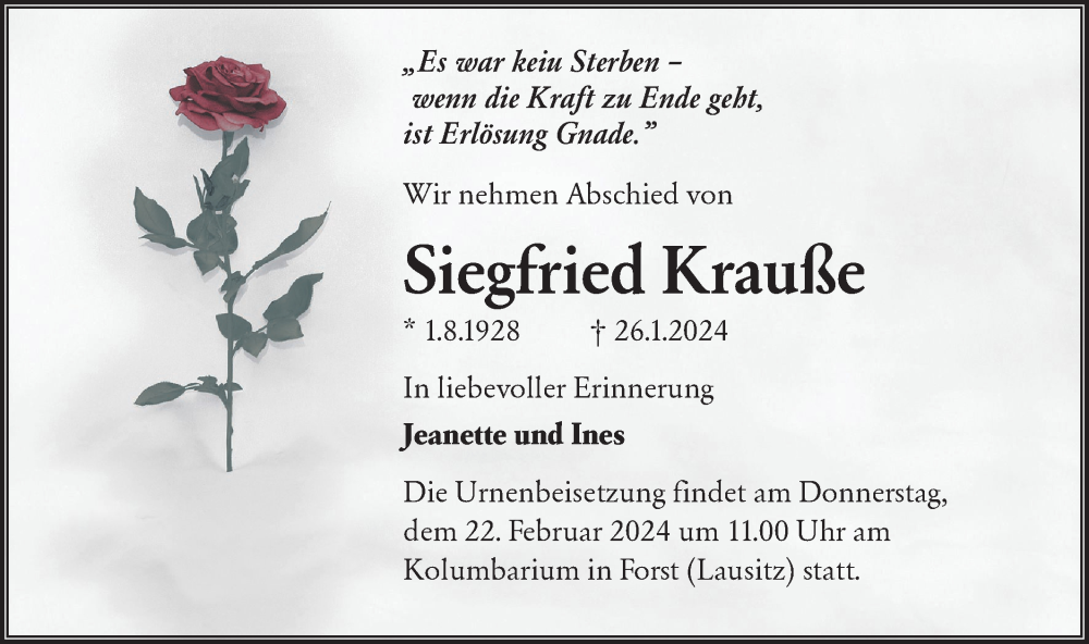 Hier finden Sie alle Traueranzeigen aus der Zeitung, die bisher für Siegfried Krauße erschienen sind. Weitere Traueranzeigen, die in der Zeitung erscheinen, werden hier ebenfalls aufgelistet