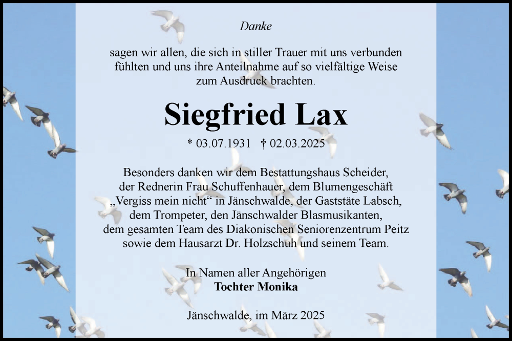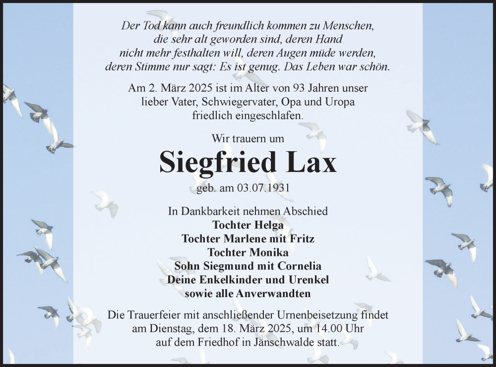Hier finden Sie alle Traueranzeigen aus der Zeitung, die bisher für Siegfried Lax erschienen sind. Weitere Traueranzeigen, die in der Zeitung erscheinen, werden hier ebenfalls aufgelistet