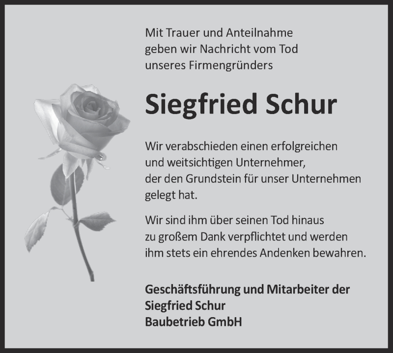 Hier finden Sie alle Traueranzeigen aus der Zeitung, die bisher für Siegfried Schur erschienen sind. Weitere Traueranzeigen, die in der Zeitung erscheinen, werden hier ebenfalls aufgelistet