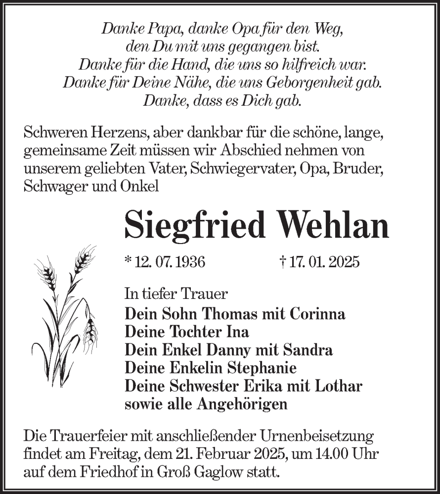 Hier finden Sie alle Traueranzeigen aus der Zeitung, die bisher für Siegfried Wehlan erschienen sind. Weitere Traueranzeigen, die in der Zeitung erscheinen, werden hier ebenfalls aufgelistet