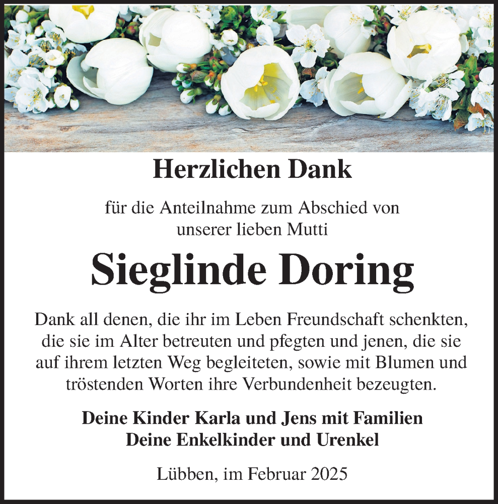 Hier finden Sie alle Traueranzeigen aus der Zeitung, die bisher für Sieglinde Doring erschienen sind. Weitere Traueranzeigen, die in der Zeitung erscheinen, werden hier ebenfalls aufgelistet