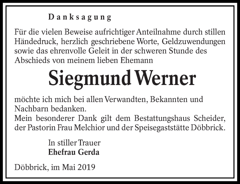 Hier finden Sie alle Traueranzeigen aus der Zeitung, die bisher für Siegmund Werner erschienen sind. Weitere Traueranzeigen, die in der Zeitung erscheinen, werden hier ebenfalls aufgelistet