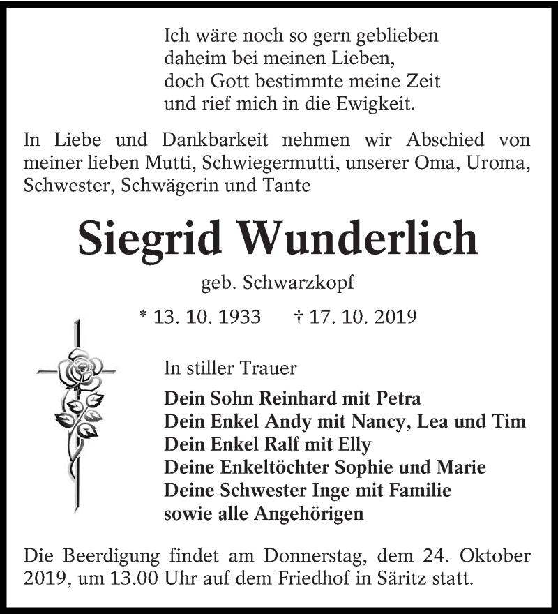 Hier finden Sie alle Traueranzeigen aus der Zeitung, die bisher für Siegrid Wunderlich erschienen sind. Weitere Traueranzeigen, die in der Zeitung erscheinen, werden hier ebenfalls aufgelistet