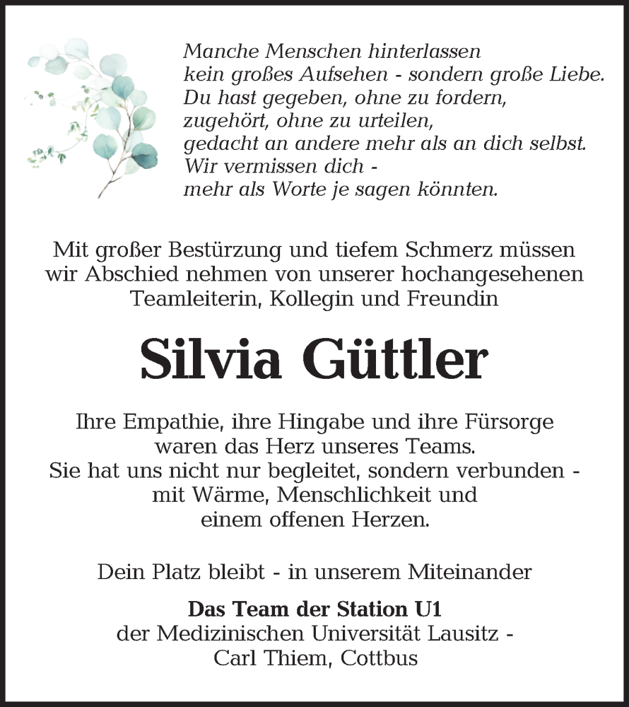 Hier finden Sie alle Traueranzeigen aus der Zeitung, die bisher für Silvia Güttler erschienen sind. Weitere Traueranzeigen, die in der Zeitung erscheinen, werden hier ebenfalls aufgelistet