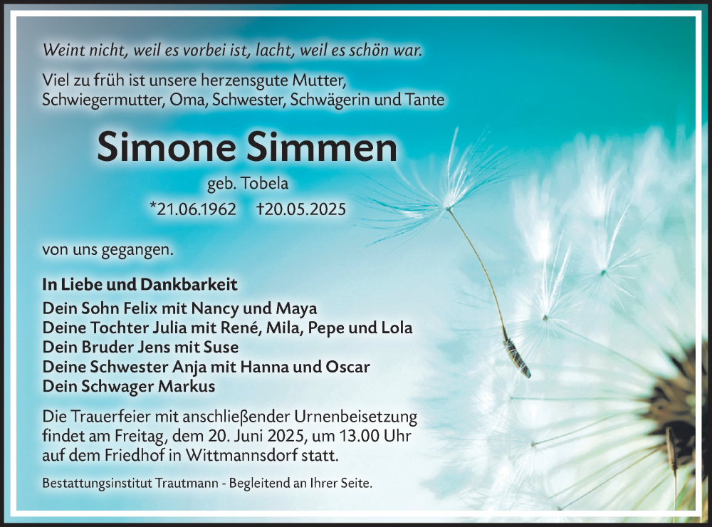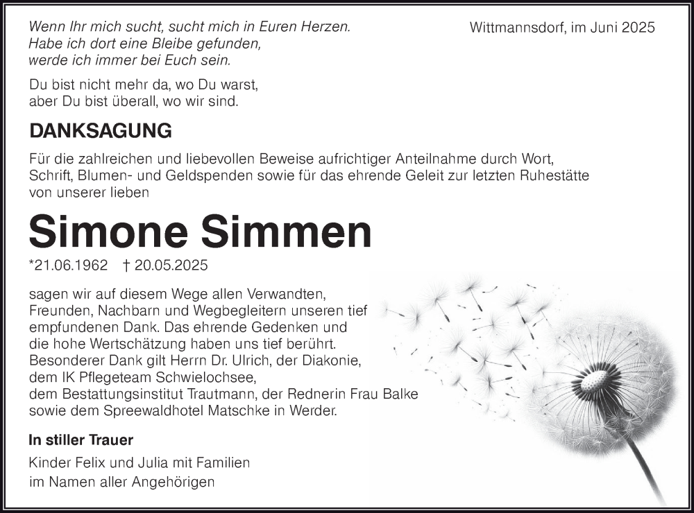 Hier finden Sie alle Traueranzeigen aus der Zeitung, die bisher für Simone Simmen erschienen sind. Weitere Traueranzeigen, die in der Zeitung erscheinen, werden hier ebenfalls aufgelistet