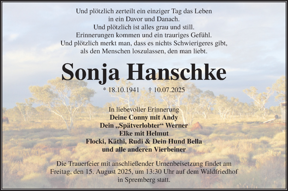 Hier finden Sie alle Traueranzeigen aus der Zeitung, die bisher für Sonja Hanschke erschienen sind. Weitere Traueranzeigen, die in der Zeitung erscheinen, werden hier ebenfalls aufgelistet