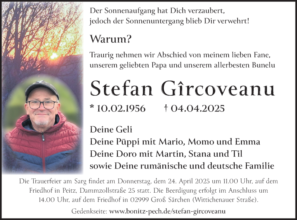 Hier finden Sie alle Traueranzeigen aus der Zeitung, die bisher für Stefan Gircoveanu erschienen sind. Weitere Traueranzeigen, die in der Zeitung erscheinen, werden hier ebenfalls aufgelistet