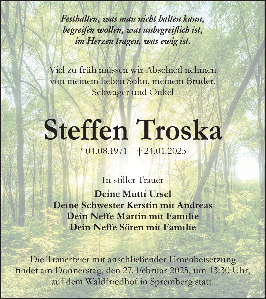 Hier finden Sie alle Traueranzeigen aus der Zeitung, die bisher für Steffen Troska erschienen sind. Weitere Traueranzeigen, die in der Zeitung erscheinen, werden hier ebenfalls aufgelistet