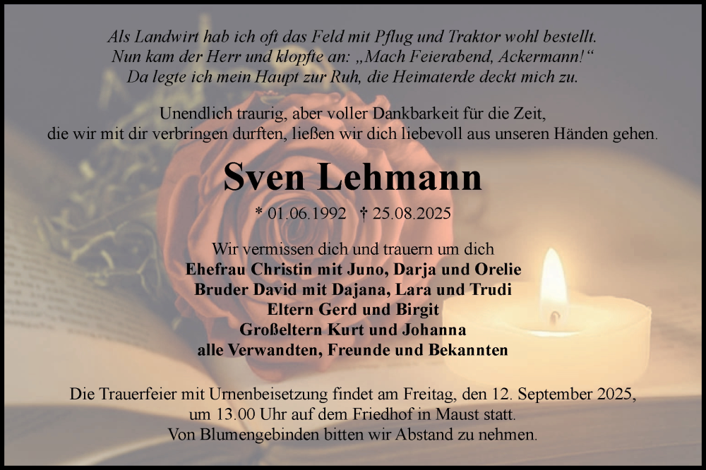 Hier finden Sie alle Traueranzeigen aus der Zeitung, die bisher für Sven Lehmann erschienen sind. Weitere Traueranzeigen, die in der Zeitung erscheinen, werden hier ebenfalls aufgelistet