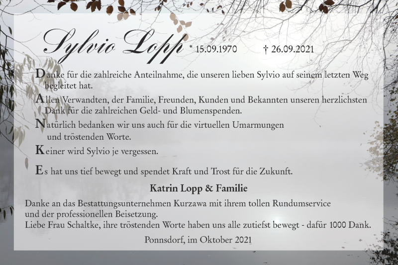 Hier finden Sie alle Traueranzeigen aus der Zeitung, die bisher für Sylvio Lopp erschienen sind. Weitere Traueranzeigen, die in der Zeitung erscheinen, werden hier ebenfalls aufgelistet