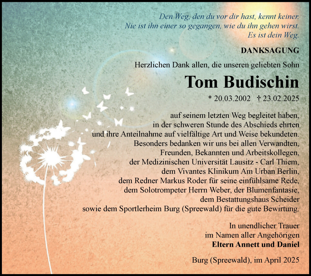 Hier finden Sie alle Traueranzeigen aus der Zeitung, die bisher für Tom Budischin erschienen sind. Weitere Traueranzeigen, die in der Zeitung erscheinen, werden hier ebenfalls aufgelistet