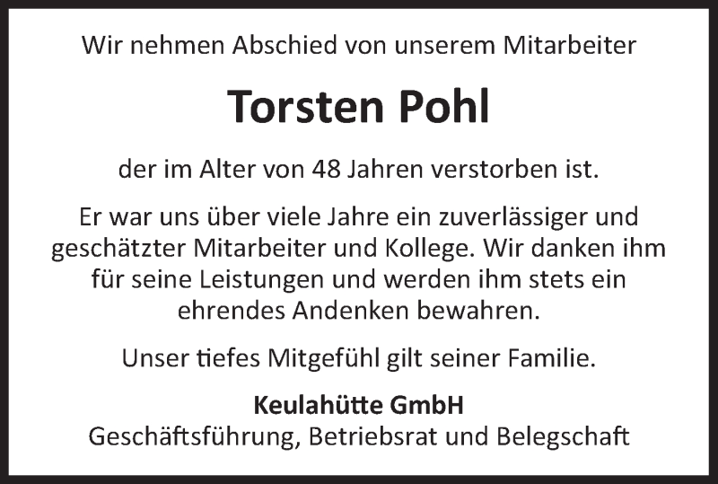 Hier finden Sie alle Traueranzeigen aus der Zeitung, die bisher für Torsten Pohl erschienen sind. Weitere Traueranzeigen, die in der Zeitung erscheinen, werden hier ebenfalls aufgelistet