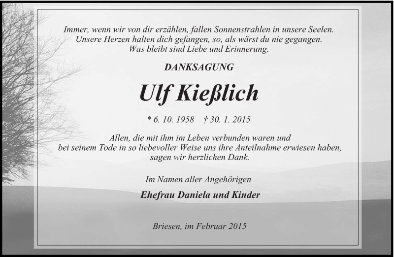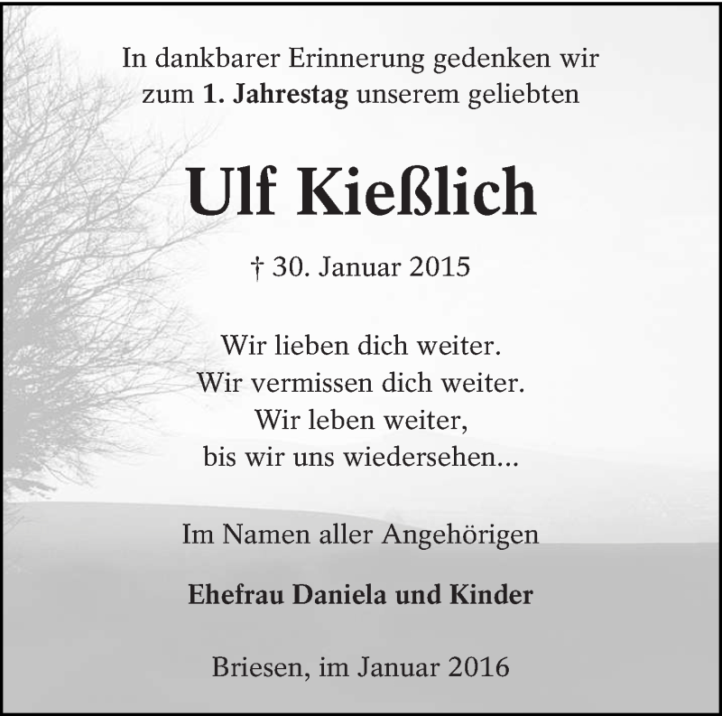 Hier finden Sie alle Traueranzeigen aus der Zeitung, die bisher für Ulf Kießlich erschienen sind. Weitere Traueranzeigen, die in der Zeitung erscheinen, werden hier ebenfalls aufgelistet