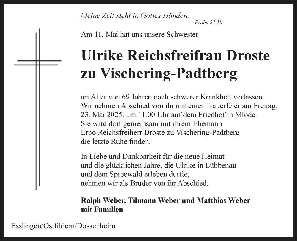 Hier finden Sie alle Traueranzeigen aus der Zeitung, die bisher für Ulrike Reichsfreifrau Droste zu Vischering-Padtberg erschienen sind. Weitere Traueranzeigen, die in der Zeitung erscheinen, werden hier ebenfalls aufgelistet