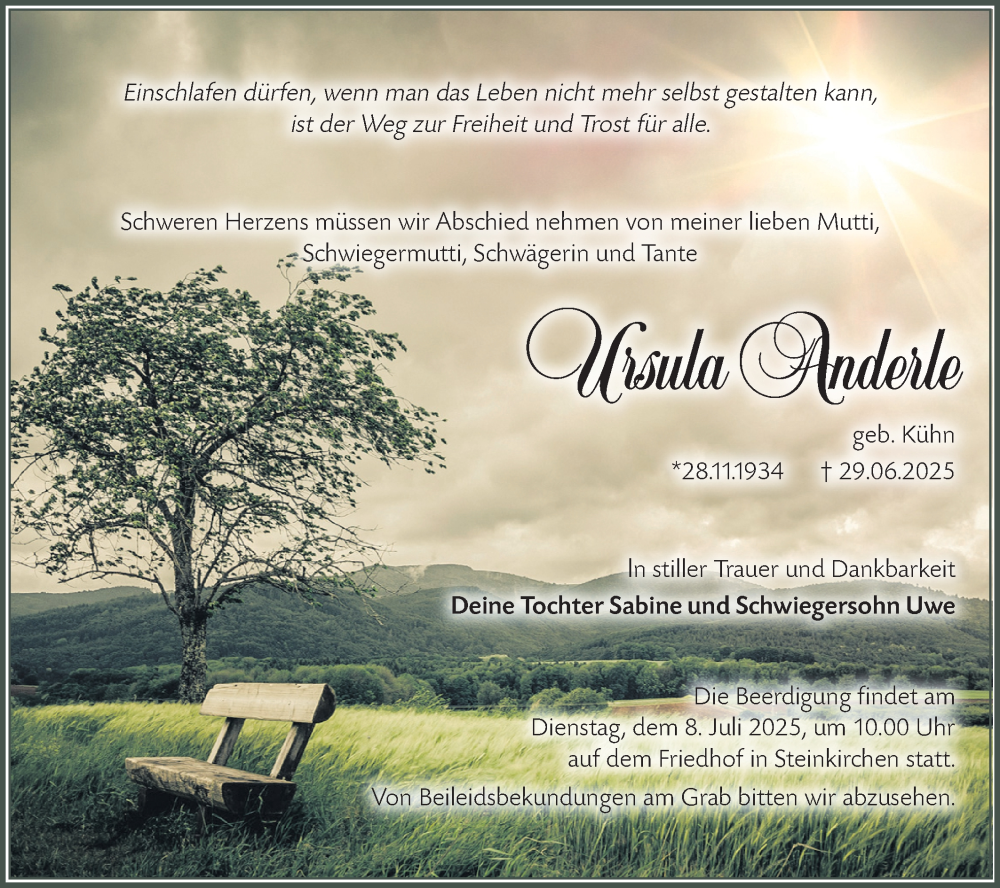 Hier finden Sie alle Traueranzeigen aus der Zeitung, die bisher für Ursula Anderle erschienen sind. Weitere Traueranzeigen, die in der Zeitung erscheinen, werden hier ebenfalls aufgelistet