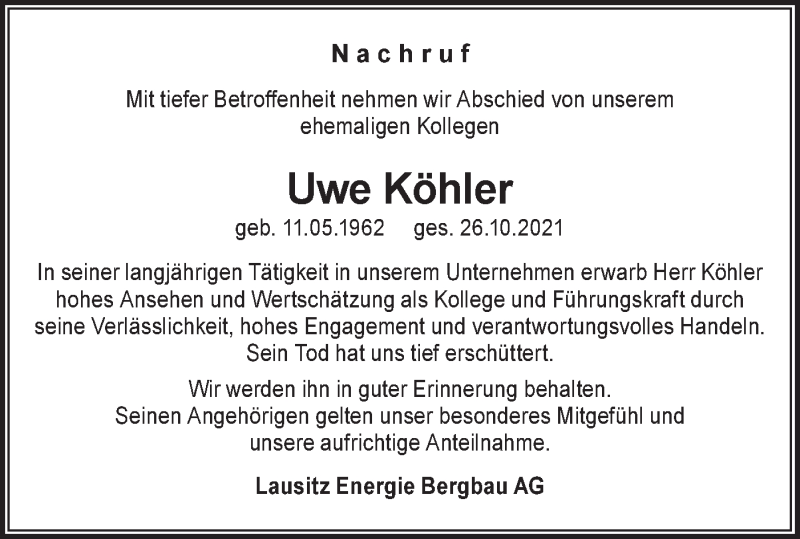 Hier finden Sie alle Traueranzeigen aus der Zeitung, die bisher für Uwe Köhler erschienen sind. Weitere Traueranzeigen, die in der Zeitung erscheinen, werden hier ebenfalls aufgelistet