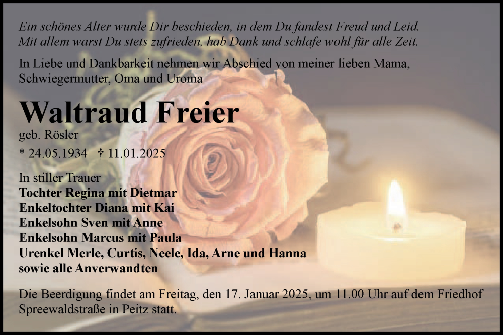 Hier finden Sie alle Traueranzeigen aus der Zeitung, die bisher für Waltraud Freier erschienen sind. Weitere Traueranzeigen, die in der Zeitung erscheinen, werden hier ebenfalls aufgelistet
