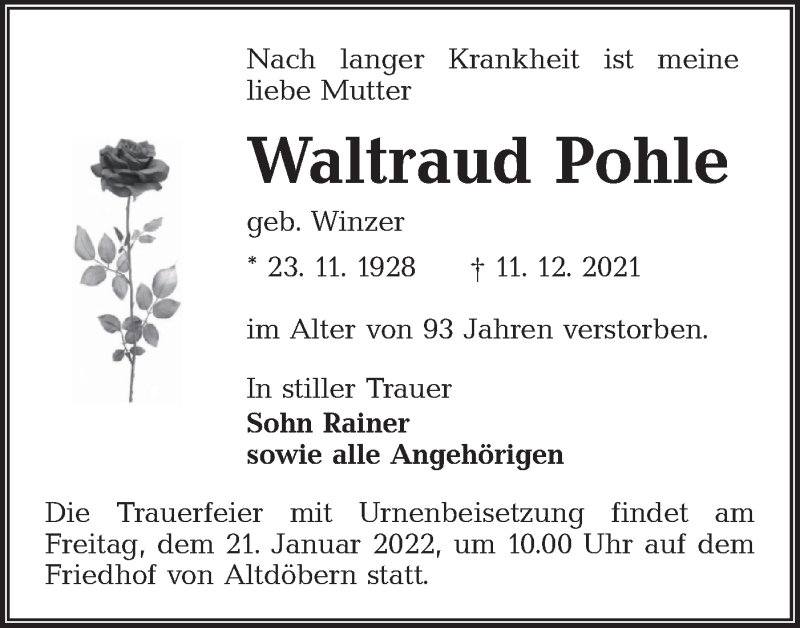 Hier finden Sie alle Traueranzeigen aus der Zeitung, die bisher für Waltraud Pohle erschienen sind. Weitere Traueranzeigen, die in der Zeitung erscheinen, werden hier ebenfalls aufgelistet