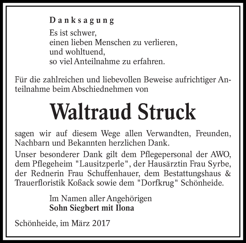 Hier finden Sie alle Traueranzeigen aus der Zeitung, die bisher für Waltraud Struck erschienen sind. Weitere Traueranzeigen, die in der Zeitung erscheinen, werden hier ebenfalls aufgelistet