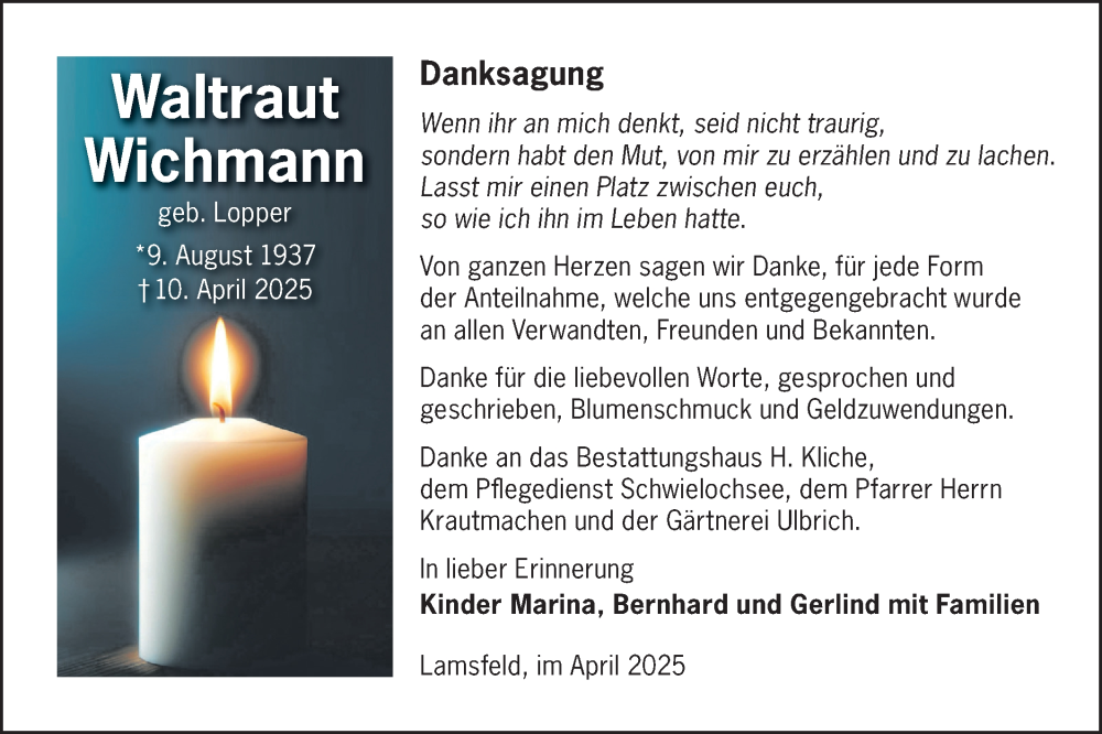 Hier finden Sie alle Traueranzeigen aus der Zeitung, die bisher für Waltraut Lopper erschienen sind. Weitere Traueranzeigen, die in der Zeitung erscheinen, werden hier ebenfalls aufgelistet