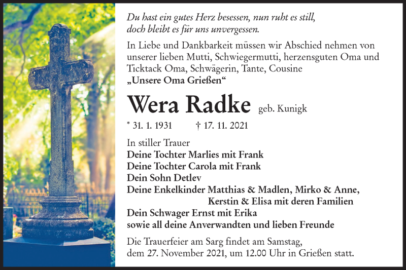 Hier finden Sie alle Traueranzeigen aus der Zeitung, die bisher für Wera Radke erschienen sind. Weitere Traueranzeigen, die in der Zeitung erscheinen, werden hier ebenfalls aufgelistet
